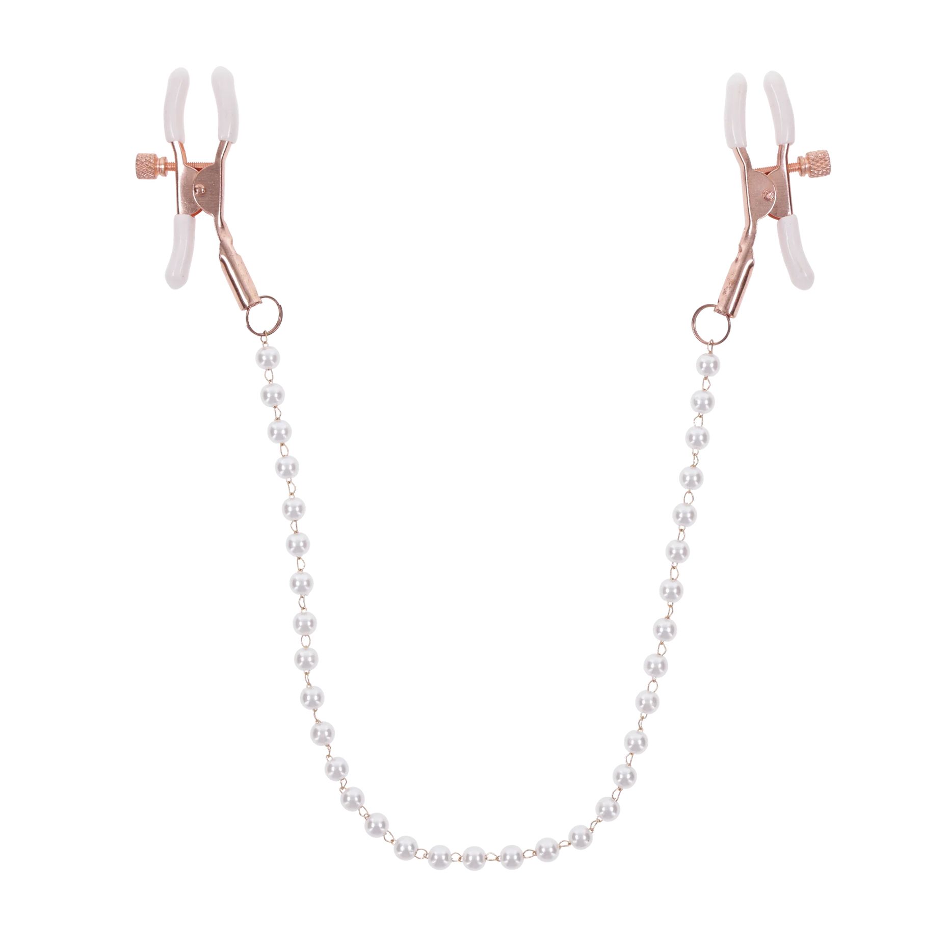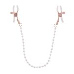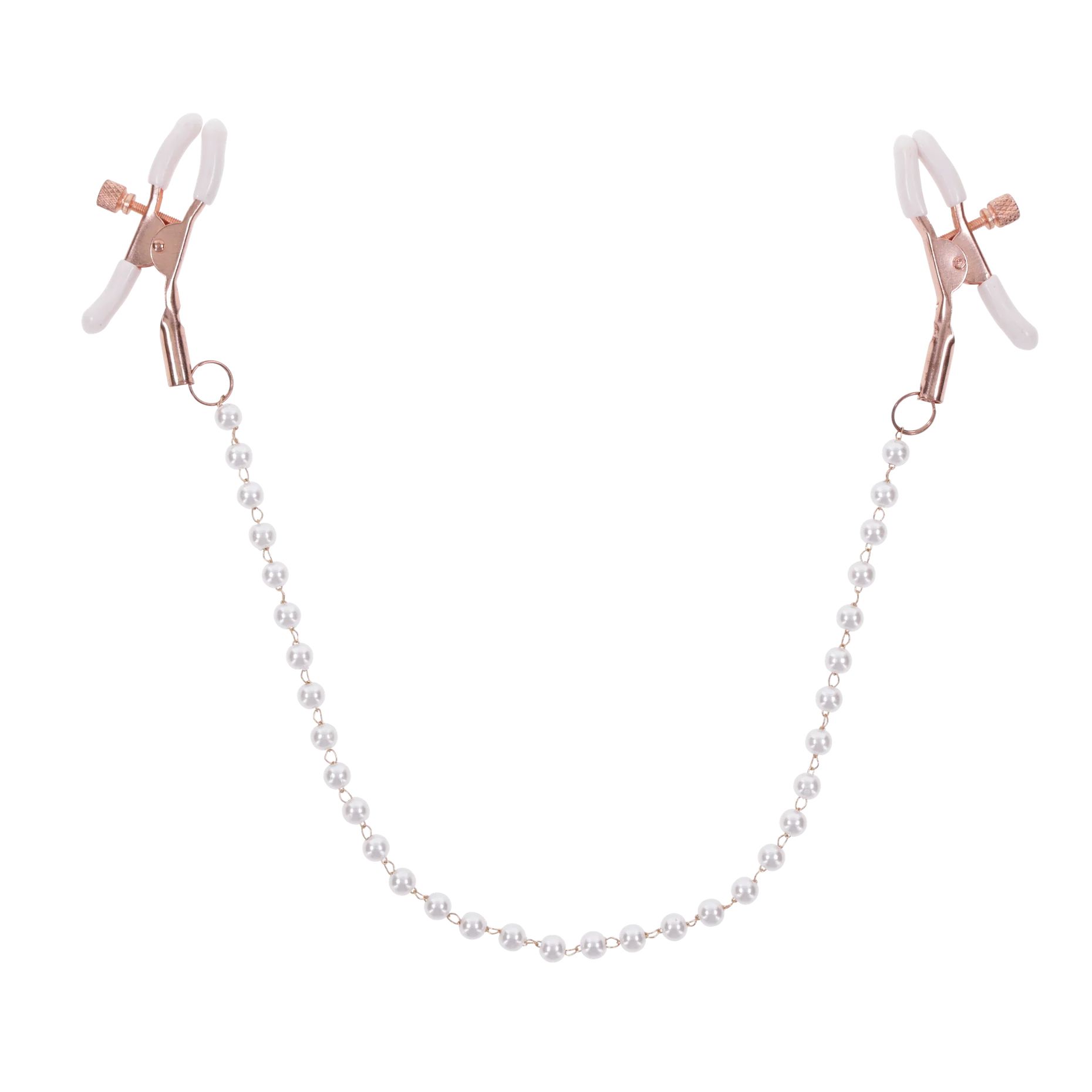 Voel intensere sensaties met de Peaches ‘n CreaMe Pearl Nipple Clamps. De set bevat twee verstelbare klemmen in elegant roségoud met parelaccenten. De witte rubberen tips zorgen voor extra grip en verhogen de gevoeligheid terwijl je speelt, trekt en verleidt. De parelversierde ketting voegt een speels en stijlvol element toe aan je bondage-avonturen.