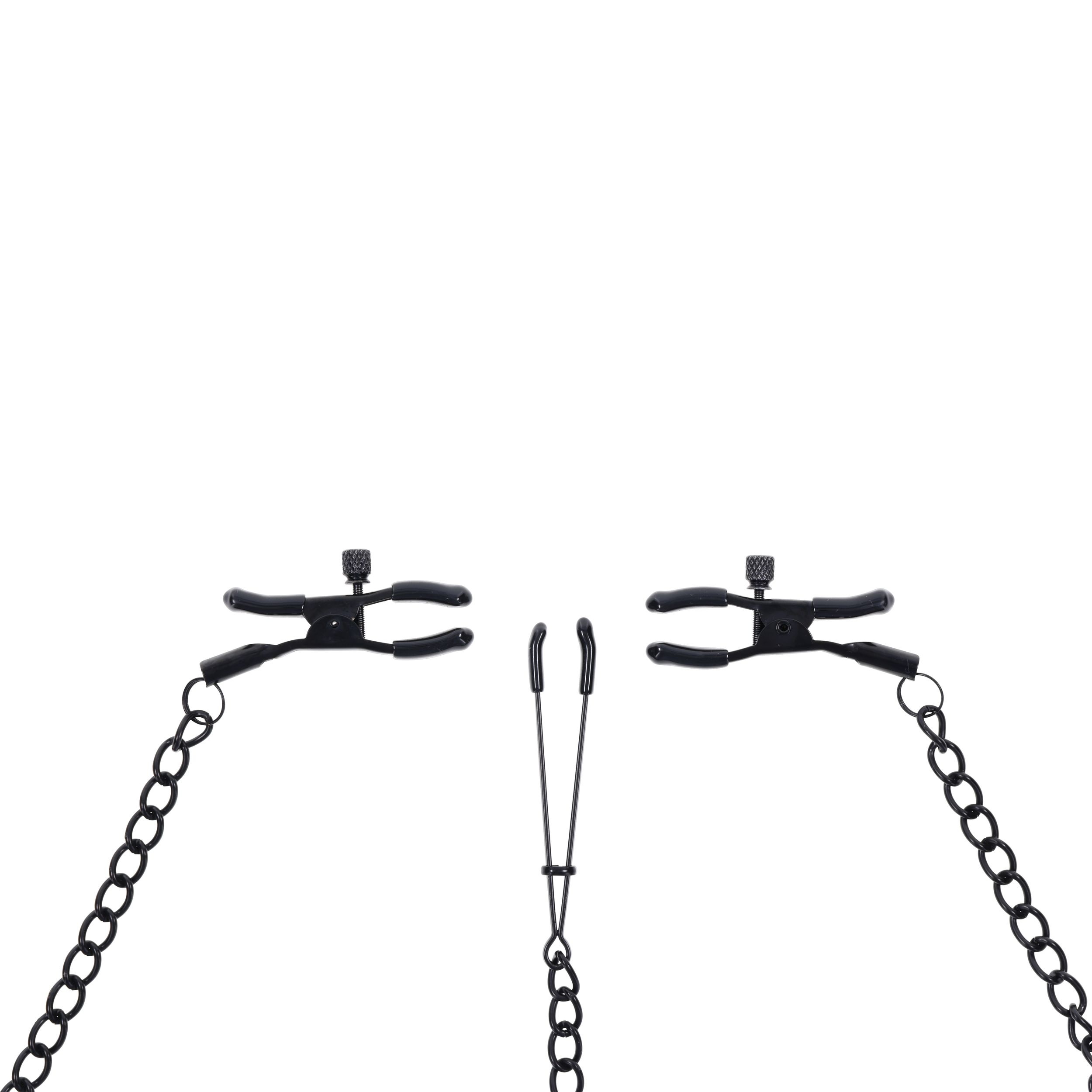 Laat je passies ontvlammen en breng intimiteit naar sensationele nieuwe hoogten met de Saffron Nipple to Clit set. Perfect vervaardigd voor gebruik zowel in als buiten de slaapkamer, voel de illustere zwarte kettingen langs je lichaam hangen vanaf de verbonden kettinghalsband. Plaag jezelf met de bijgevoegde tepelklemmen om druk en opwinding toe te voegen aan je meest gevoelige gebieden, terwijl een derde pincetklem zich uitstrekt naar je clitoris voor verleidelijk sensuele spanning. Perfect om verhoogde ervaringen te creëren tijdens sensatie spel of als speelse herinnering aan je onderdanige plaats terwijl het onder je kleding wordt gedragen. Veilig en comfortabel, de Nipple to Clit Set stelt je in staat om je plezier te reguleren zoals je wilt terwijl ze trekken en plagen bij elke beweging.