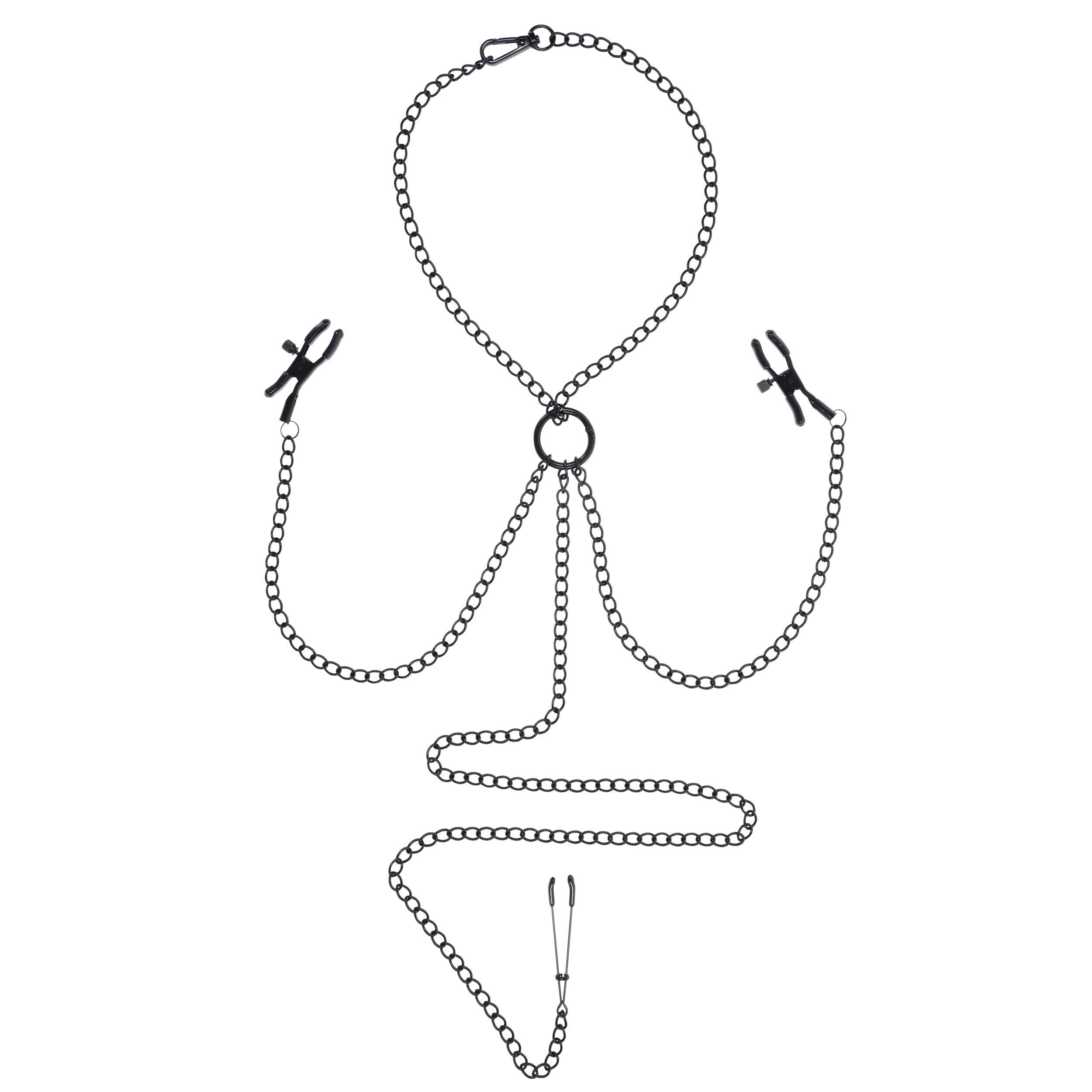 Kettinghalsband verbindt met tepel- en clitorisklemmen met een centrale O-ring