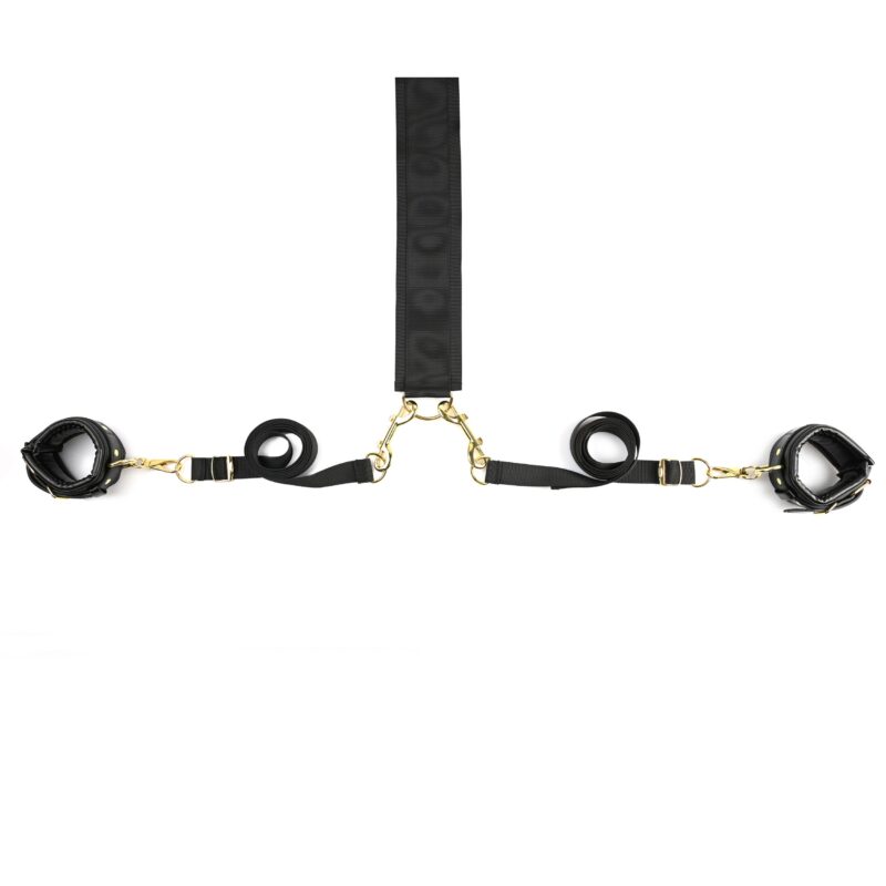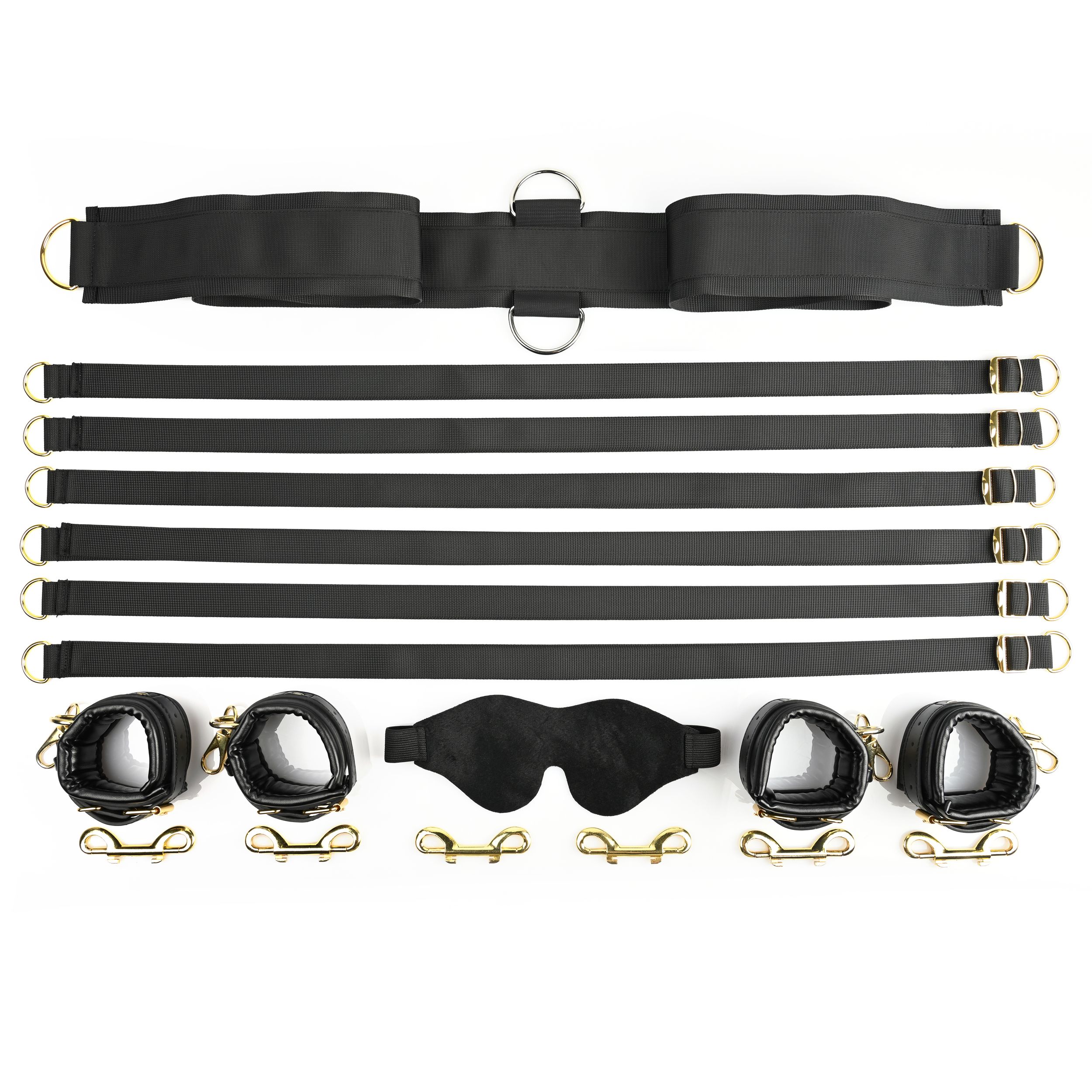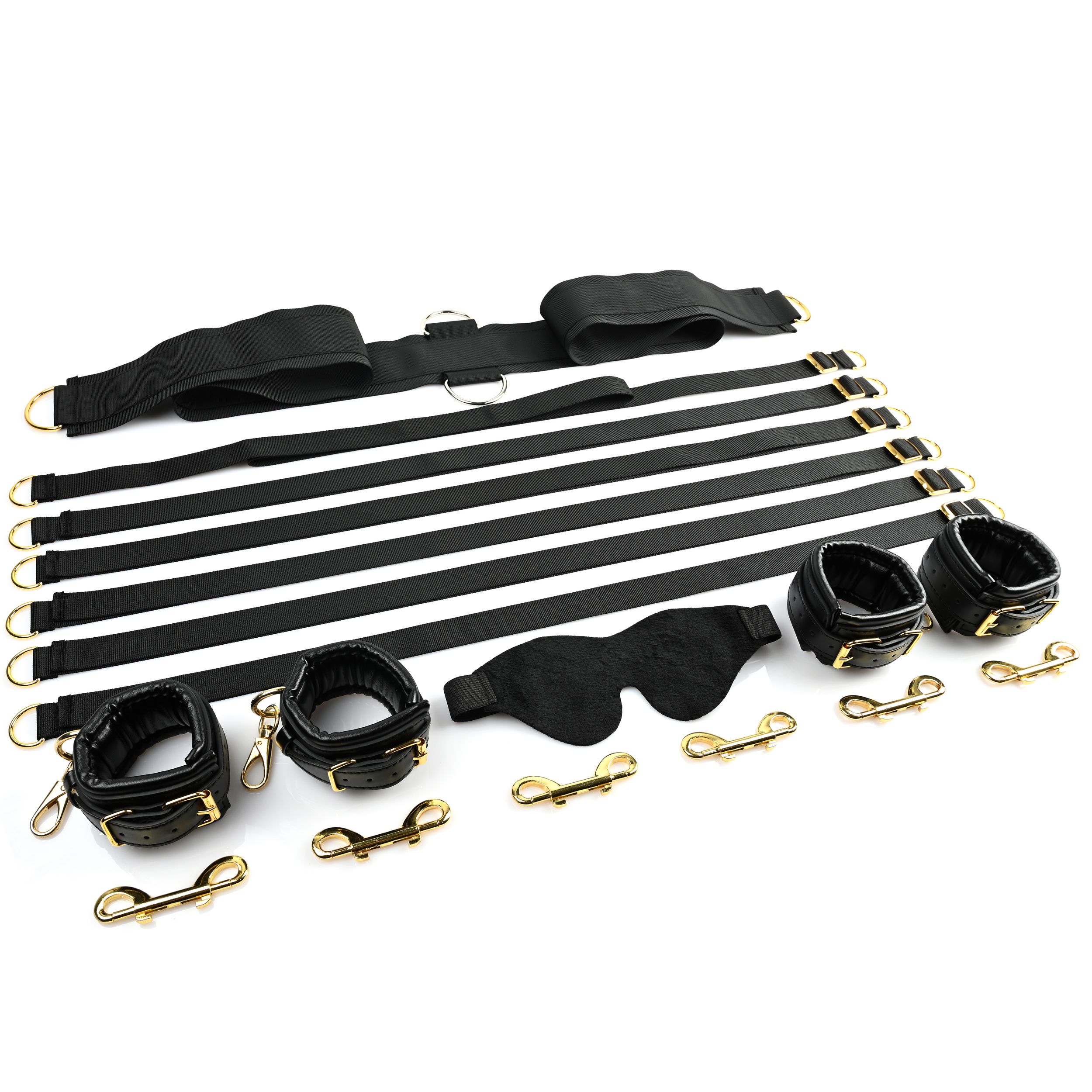 Een sterke nylon ankerverbindingsriem schuift onder uw matras om zes verstelbare bevestigingsriemen vast te zetten. Vier bandjes eindigen in hoogwaardige kunstleren pols- en enkelboeien met gouden hardware, terwijl twee zijn gemaakt met lussen die allerlei soorten hefboomwerking beloven. Plaats de banden om je matras zoals jij dat wilt, bind je geliefde stevig vast en schuif de zachte fluwelen blinddoek over hun ogen voor een sessie vol verrassingen.