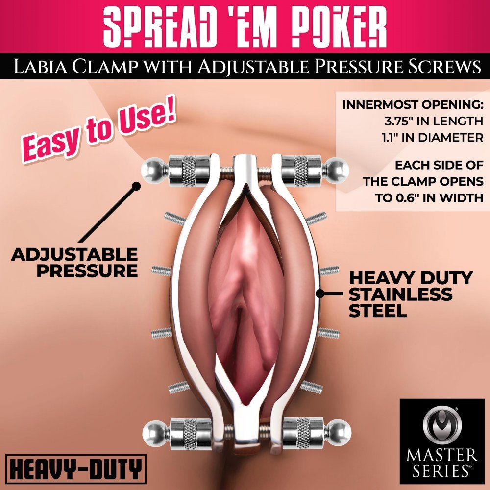 Met de Spread ‘Em Poker Vagina Klem kun je je schaamlippen uitdagend spreiden. De klem is gemaakt van duurzaam nikkelvrij RVS. Aan de boven- en onderkant zitten twee klemschroeven die je kunt draaien om de klem te sluiten of te openen. Je kunt elk soort glijmiddel gebruiken. Reinig na gebruik met toycleaner en lauwwarm water. Deze klem is ook perfect voor Temperature Play.