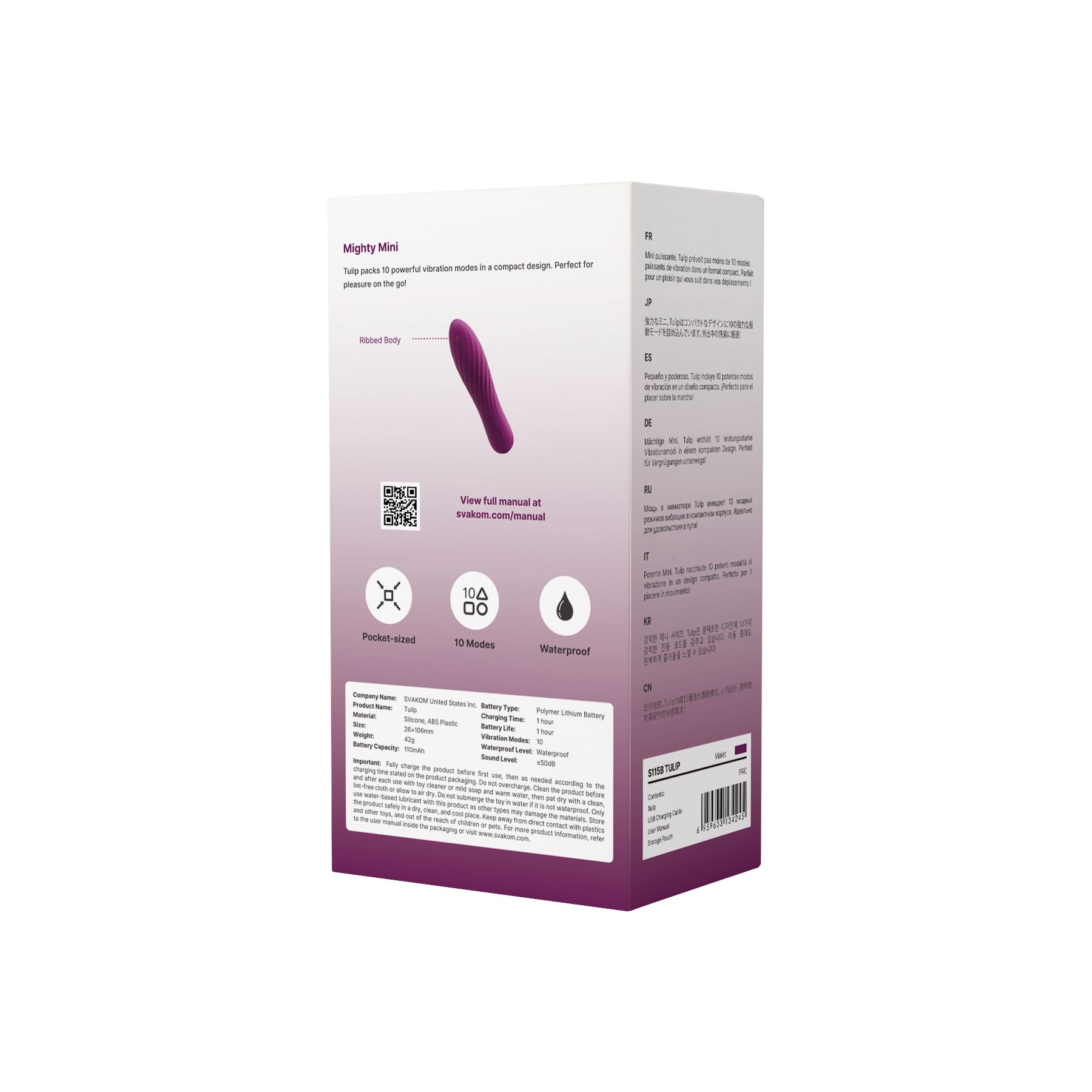 Geniet van intense vibraties met de Svakom Tulip vibrator! Deze vibrator is compact van formaat maar wel zeer krachtig. Zet hem eenvoudig aan met een druk op de knop en schakel eenvoudig tussen 10 krachtige vibratiestanden. De vibrator is voorzien van ultra zacht en lichaamsveilig siliconen dat samen met het geribbelde curve-ontwerp ervoor zorgt dat Tulip comfortabel ingebracht kan worden. Daarnaast is de vibrator geheel waterproof zodat je hem veilig mee kunt nemen in bad of onder de douche. Reinig de vibrator na elk gebruik met lauwwarm water en een toycleaner. De Tulip is weer op te laden met de meegeleverde USB-kabel.