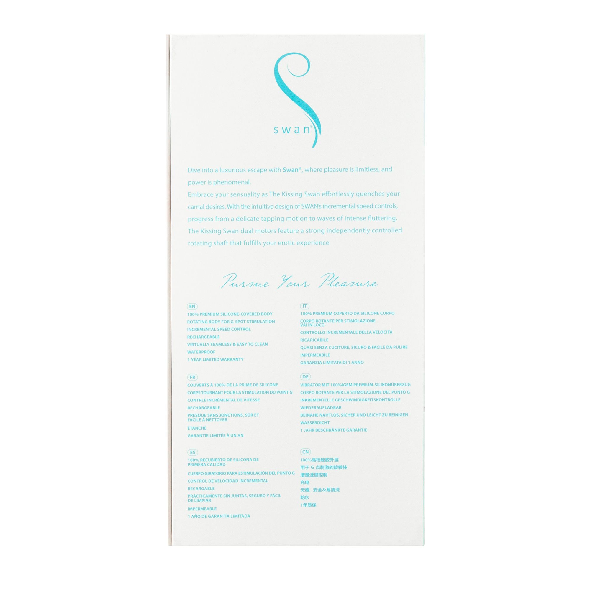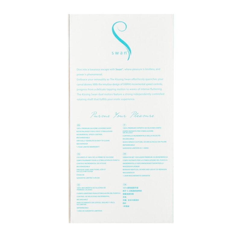 Bereid je voor op de elegante schoonheid en sensationele kracht die Swan je brengt met deze dual action vibrator. De taps toelopende, gebogen tip op het roterende lichaam is ontworpen om je G-Spot te masseren en als de rotaties versnellen, doen de sensaties dat ook. De clitorale arm in konijnstijl heeft een allesomvattende top met elegante bloemblaadjes die flikkeren en fladderen als de vibratiesnelheden toenemen en krachtige vibraties leveren aan je meest gevoelige gebied.