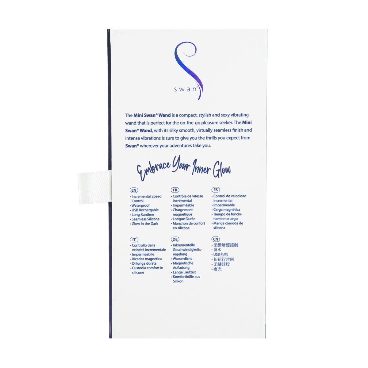 Aangedreven door de ongelooflijke Power Bullet motor en de bekende Swan ?Press & Hold? -bediening. Ontworpen met jou in gedachten, een van de vele geweldige kenmerken van de Mini Swan Wand is ons reis slotsysteem. U kunt in alle rust op reis gaan, wetende dat hij niet onverwachts afgaat en uw bagage niet dendert van de kracht. Wordt geleverd met een satijnen opbergzakje voor speelgoedbescherming en privacy tegen nieuwsgierige blikken.