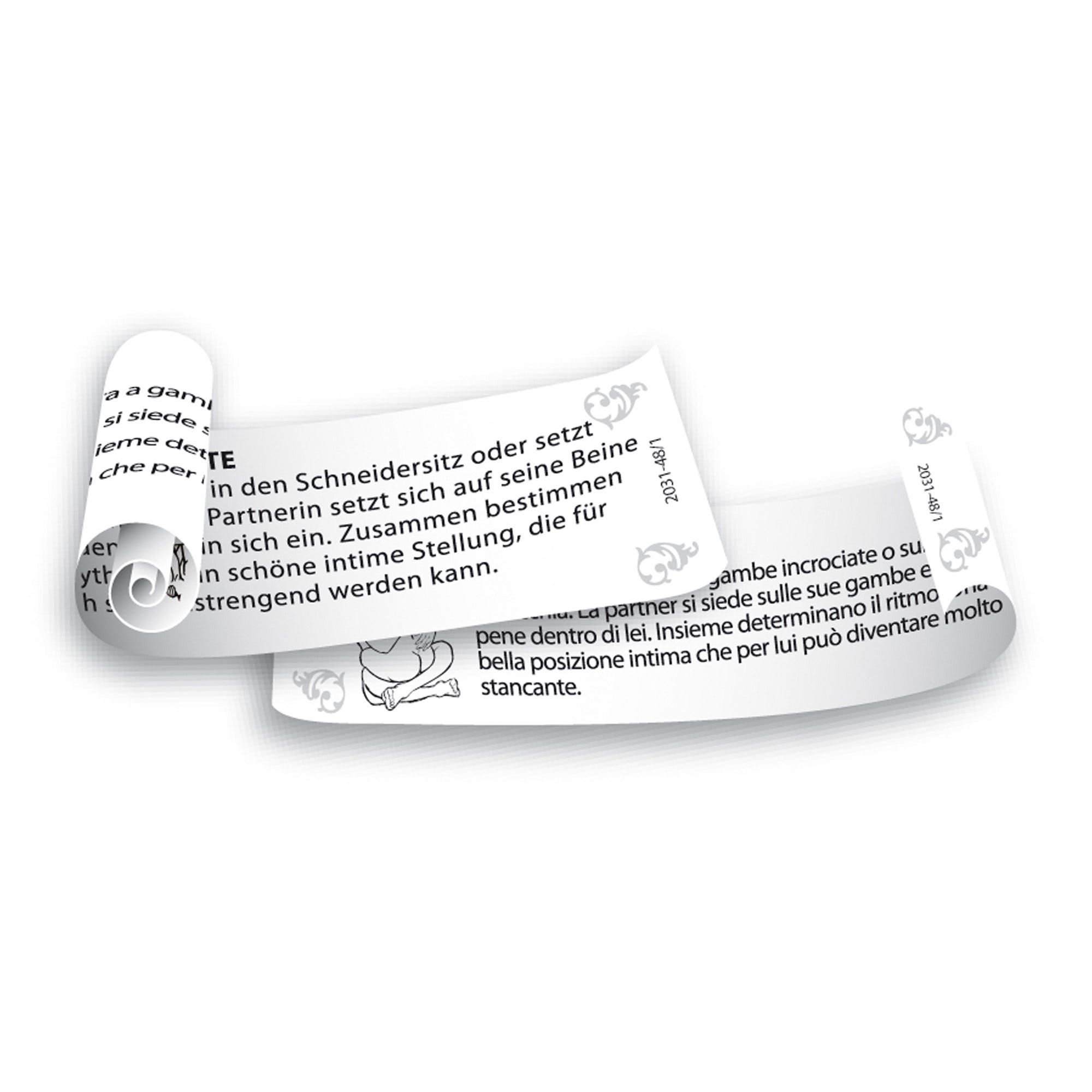 Dit spel nodigt uit tot speelse interactie, creatieve verkenning en diepere verbinding. Dankzij het compacte formaat en de tweetalige inhoud (Duits & Italiaans) is het ook een perfect cadeau voor avontuurlijke koppels. Een ondeugend gebaar vol passie en plezier.