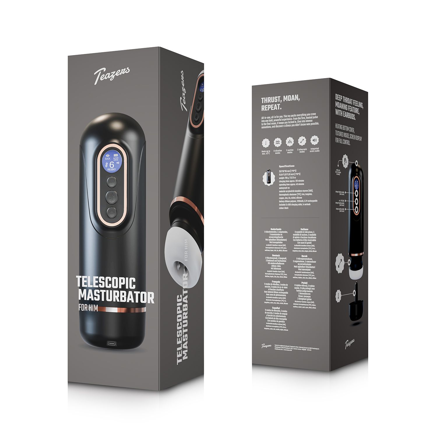 Met meerdere vibratiepatronen, verschillende zuigstanden en aparte wrijffuncties kun je eenvoudig schakelen tussen subtiele prikkels en krachtigere sensaties. Het telescopische ontwerp beweegt mee met jouw lichaam en versterkt het gevoel van diepte en afwisseling. Voor extra realisme kan de optionele verwarmingskap worden geactiveerd, waardoor de binnenzijde aangenaam warm wordt en een levensechte ervaring benadert.