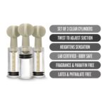 Geniet van een geheel nieuwe sensatie met deze 3 delige set tepel en clitoris zuigers! De zuigers zijn doorzichtig en plaats je op tepels en/ of clitoris. Draai de zuigers voorzichtig steeds wat vaster en bewonder vervolgens hoe de tepels of clitoris opzwellen. Door het ontstane vacuüm blijft de zwelling langere tijd zichtbaar en verhoogt het de gevoeligheid bij aanrakingen of stimulatie.