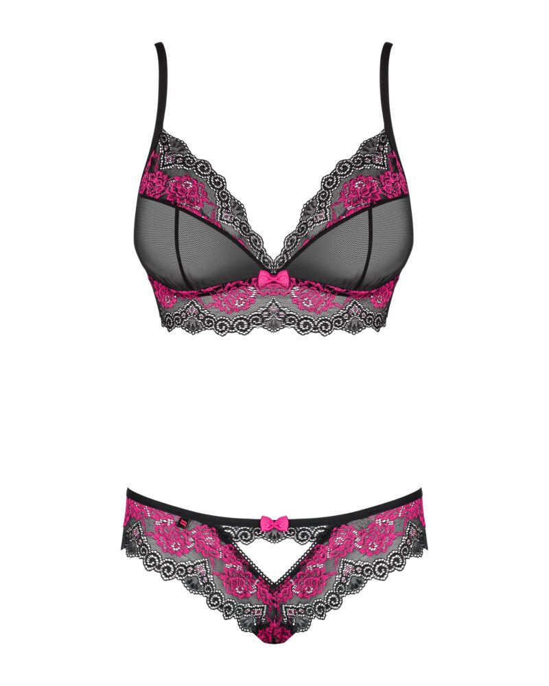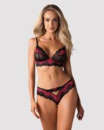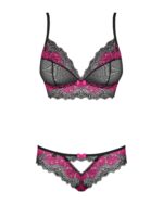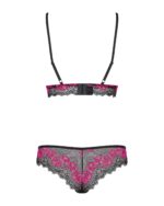 Voel je sexy in deze opvallende 2-delige BH set! De set bestaat uit een BH met ongevoerde cups en een bijpassende slip. Deze set heeft prachtige kanten details en de BH is deels transparant voor een uitdagende look. De schouderbandjes zijn ruim verstelbaar. Het materiaal is elastisch voor een mooie pasvorm.
