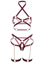 Dit van veganistisch leer gemaakte harnas is verfraaid met O-ring details en speelse hartjesaccenten, en is afgewerkt met subtiele gouden kettinkjes. Het harnas bestaat uit een verleidelijke BH-top en een verfijnde kousenband, die je allemaal in een oogwenk in de juiste stemming brengen.