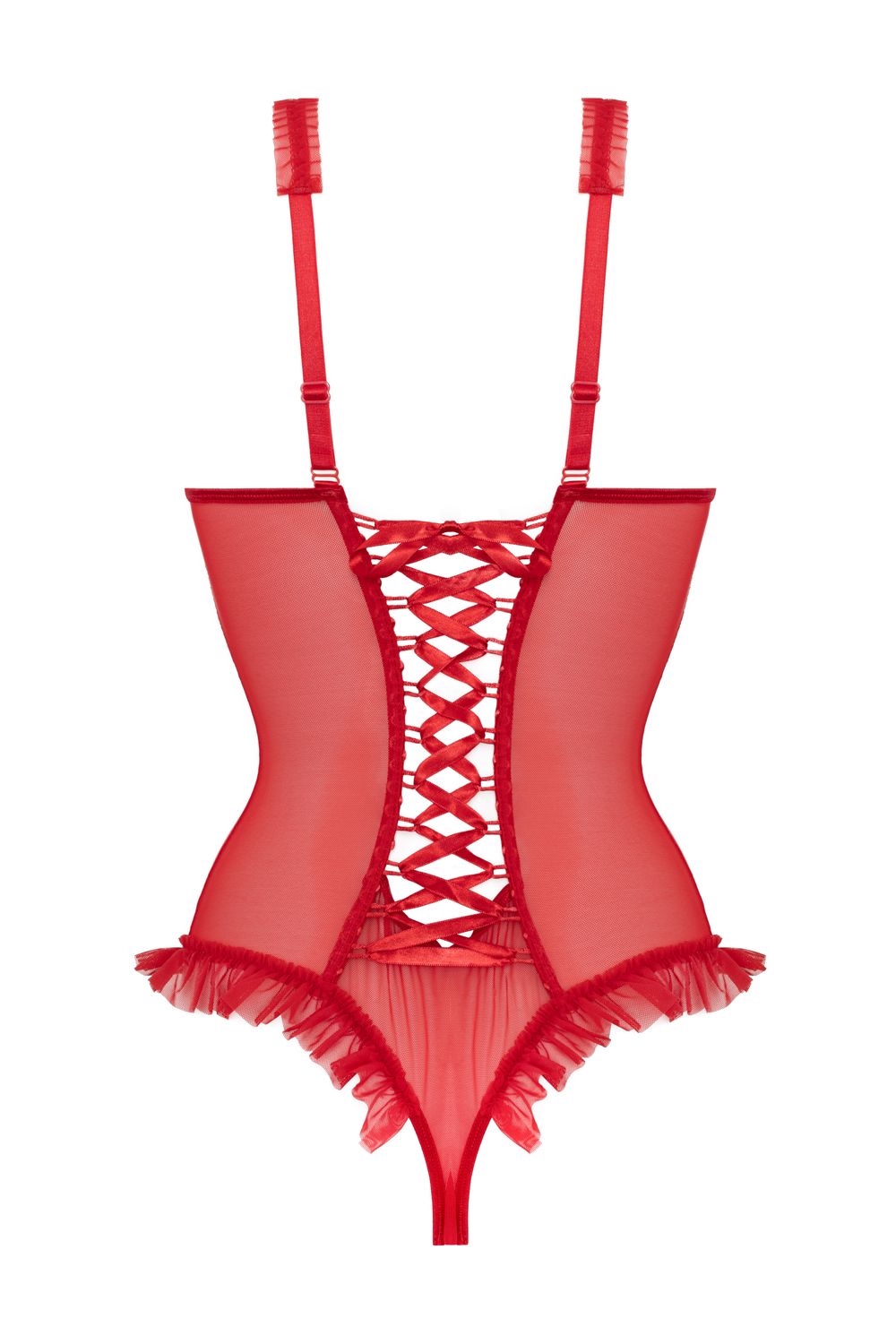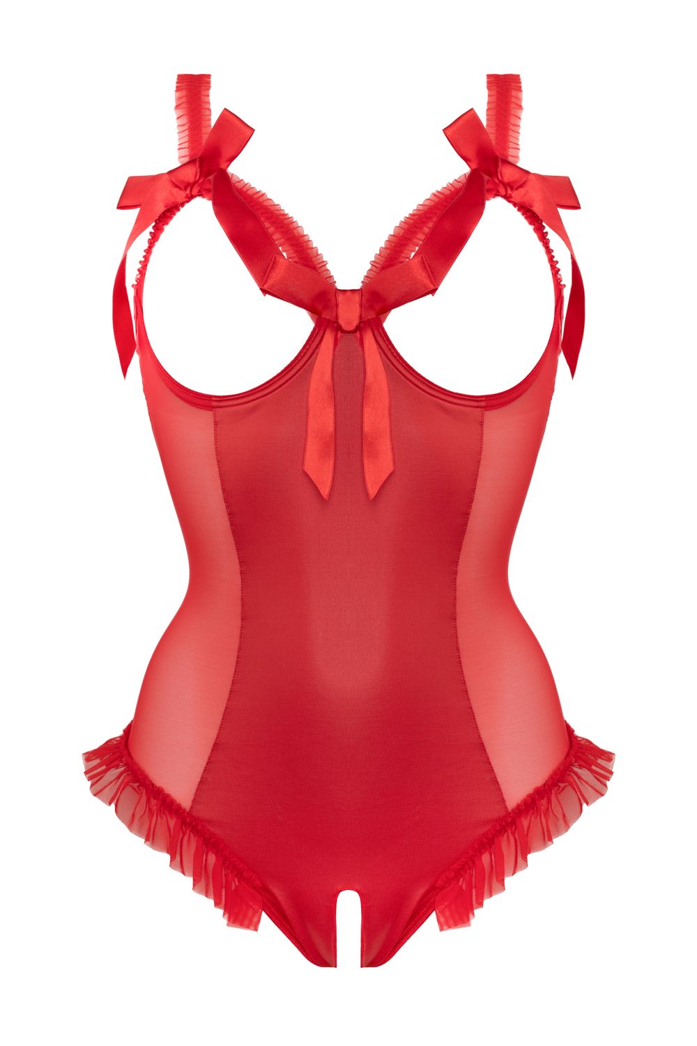 Stoute body met wetlook voorkant en transparante mesh aan de zijkanten. Open cups en open kruis. De cups hebben beugels voor extra steun aan je borsten. Satijnen vetersluiting aan de achterkant.