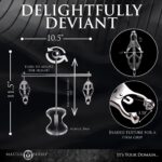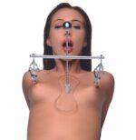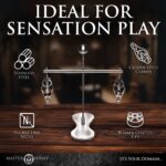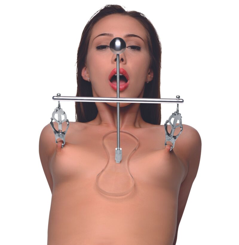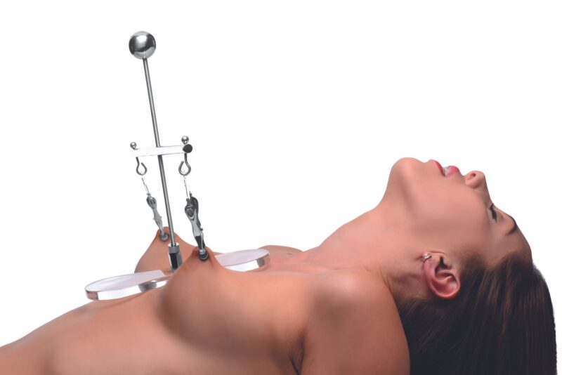 Deze toren is voorzien van clover-stijl tepelklemmen die de druk verhogen zodra ze worden aangetrokken. De toren is in hoogte verstelbaar, zodat je de perfecte stand kunt vinden. Gemaakt van roestvrij staal en nikkelvrij, dus ook geschikt voor de gevoelige huid. Het transparante platform rust tussen de tepels op hun borst als stevige basis. De set kan eenvoudig worden gedemonteerd voor opslag of transport en is makkelijk te reinigen met warm water en een toycleaner.