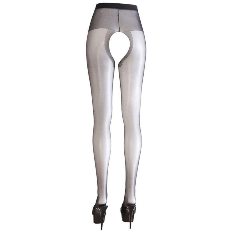 Prachtige zwarte panty van hoge kwaliteit. Deze panty heeft een licht satijnen glans voor verleidelijke gladde benen. Het open kruisje van de panty is versterkt en geeft een uitdagende blik op je kruis. De voeten van de panty zijn voorgevormd voor extra stevigheid. De panty voelt spannend tijdens het dragen en zit erg comfortabel.